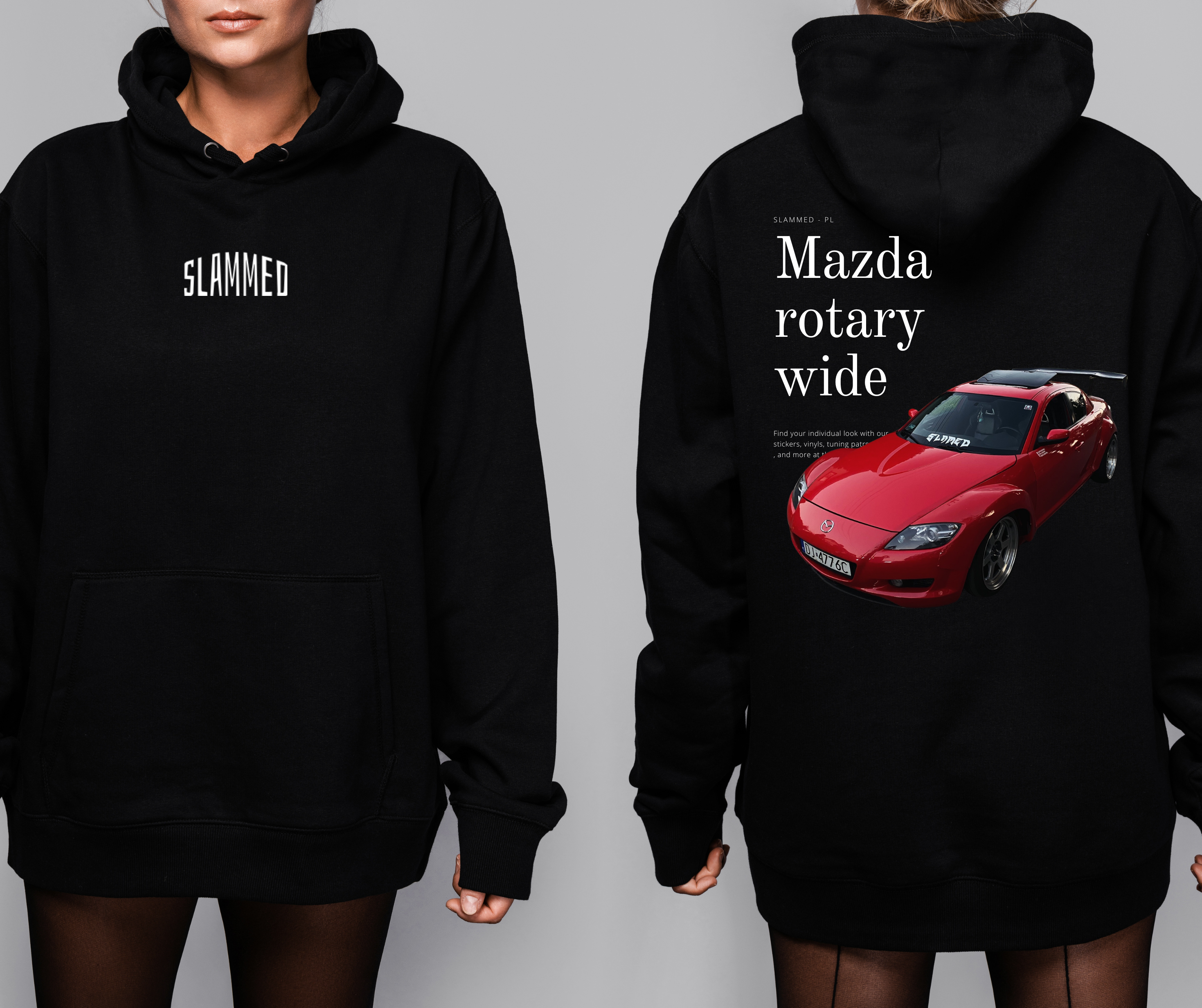 Wykonana z wysokiej jakości bawełny, zapewnia wygodę noszenia i trwałość. Na tyle bluzy znajduje się efektowny nadruk przedstawiający Mazdę RX-8 w wersji widebody, z charakterystycznymi, szerokimi nadkolami i agresywną sylwetką, która podkreśla sportowy charakter tego modelu.